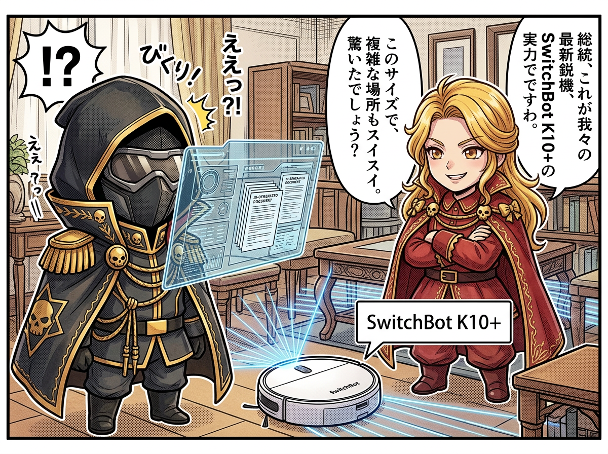 結論から言うと、SwitchBot K10+は、巨大な兵器を誇る我々黒焦団の盲点だった「狭い隙間」を完璧に制圧する、究極の隠密工作員だ! デカければ強いという時代は終わった。この小回りの良さは、基地の物陰に溜まった埃を一網打尽にするだけでなく、日本の狭いリビングを支配するための必須装備と言えよう!🔥
